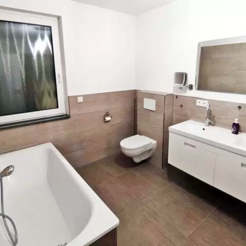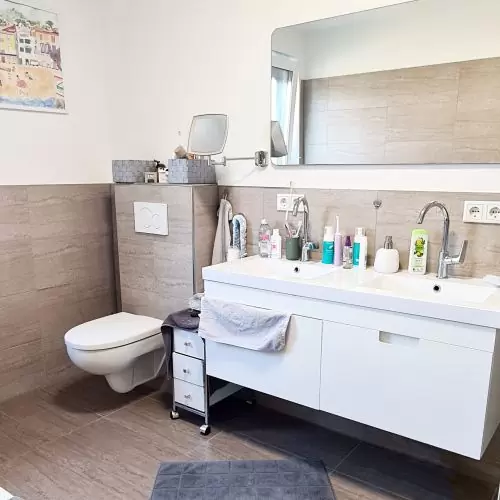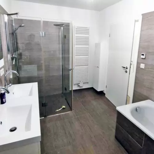 - grosses Badezimmer mit Doppelwaschtisch, ebenerdiger Duschtasse und Wanne