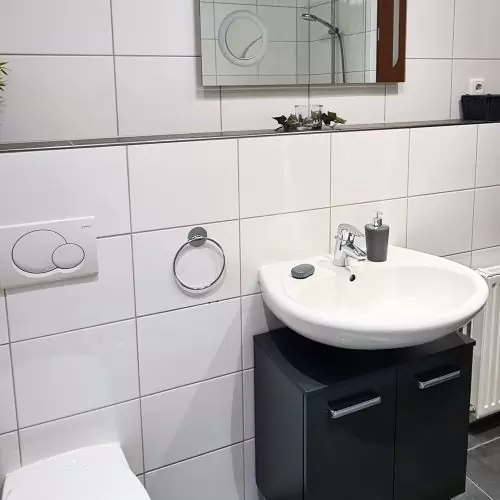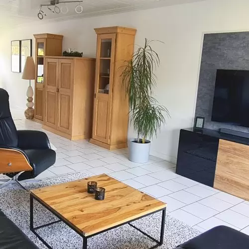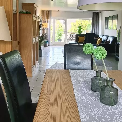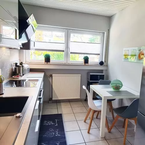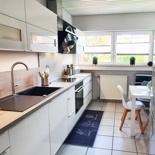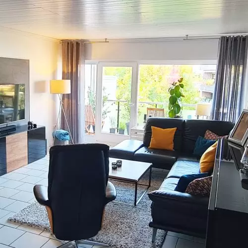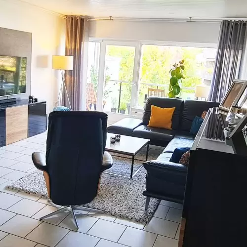 Diese wirklich sehr schöne, helle, neu renovierte Eigentumswohnung befindet sich im 1. Obergeschoss eines 1977 erbauten, gepflegten 3-Familienhauses. Das Herzstück dieser Wohnung ist zweifellos der großzügige 50m² grosse offene Wohn- und Essbereich mit direktem Zugang zur Loggia, welche einen herlichen Ausblick auf den schön angelegten Garten bietet, hier fühlen Sie sich direkt wohl! An sonnigen Tagen sorgt eine Markise für Schatten und kühlt die Wohnung dadurch runter, was insbesondere an heißen Tagen von Vorteil ist. Die Wohnung verfügt über zwei großzügig geschnittene Zimmer, eine helle Küche, eine geräumige Diele sowie ein modernes Badezimmer mit Dusche und Glasabtrennung. Der grosszügige, lichtdurchflutete Wohn- Essbereich vermittelt Wärme und Gemütlichkeit und lädt zum Entspannen und Wohlfühlen ein. Die gesamte Wohnung ist mit hochwertigen Keramikfliesen ausgestattet, das Bad ist anthrazitfarben gehalten. Zu dieser Einheit gehört außerdem ein eigener Kellerraum. Ein Anschluss für Waschmaschine und Trockner ist ebenfalls vorhanden.